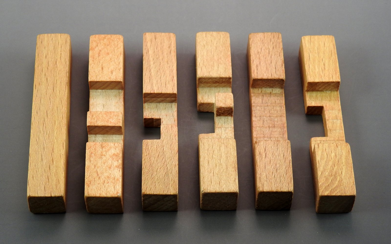 Der massive Schlüsselstein befindet sich ganz links im Bild. Entsprechend der Nummerierung der Teile für Teufelsknoten tragen diese die Nummern 1, 188, 256, 824, 992, 1024.